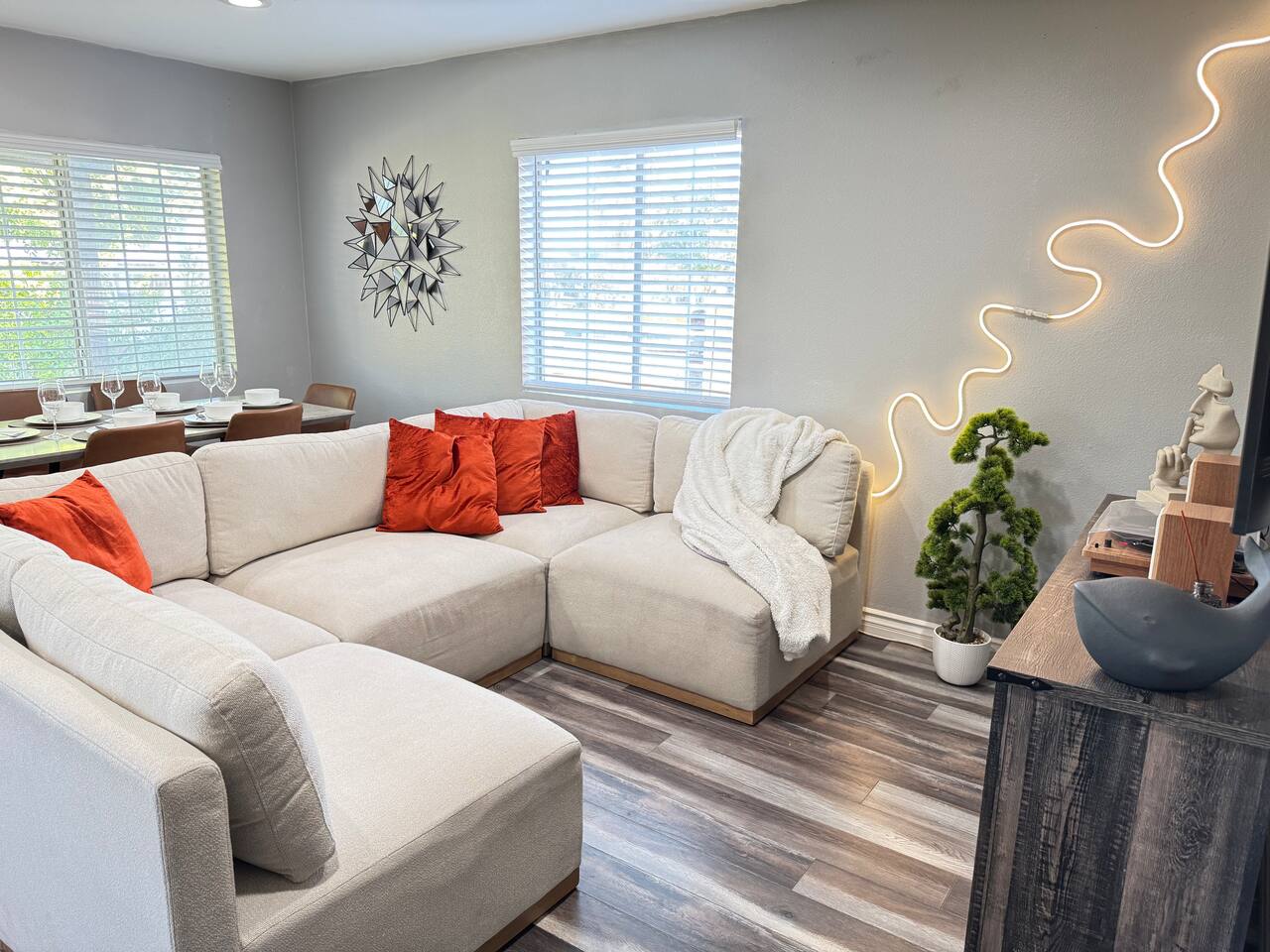 What You’ll Love: ✔ Walking Distance to NOS Center – Perfect for event-goers and festival fans. ✔ Steps from a Nearby Bar – Enjoy a fun night out just a short walk away. ✔ Spacious Layout – Comfortably accommodates up to 14 guests. Couch can sleep 2-3 ✔ Stylish Entertainment Space – Relax with a huge sectional, mounted TV, and LED lighting. ✔ Fully Equipped Kitchen – Cook your favorite meals with ease. ✔ 2 Modern Bathrooms – Clean, sleek, and stocked with essentials. ✔ Self Check-in – Enjoy a seamless arrival with our smart lock system. ✔ Highly Rated – Guests love the exceptional check-in experience and stylish decor. Additional Details: 🚠No Smoking Allowed 📍 Prime Location – Walk to NOS Center & Bars, Easy Access to Freeways 💼 Great for Business & Leisure Travelers ⏳ Book now and enjoy a cozy, modern retreat perfect for your next getaway!