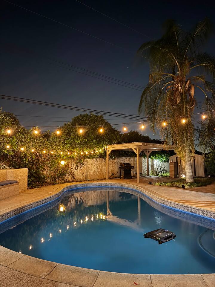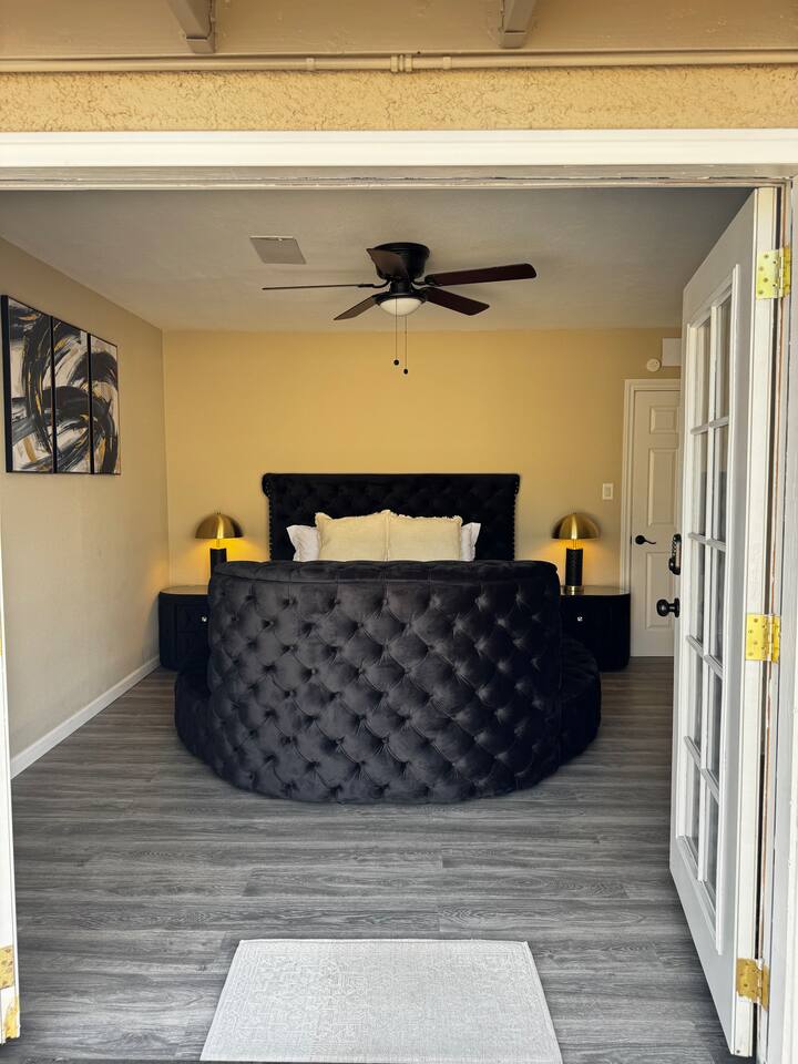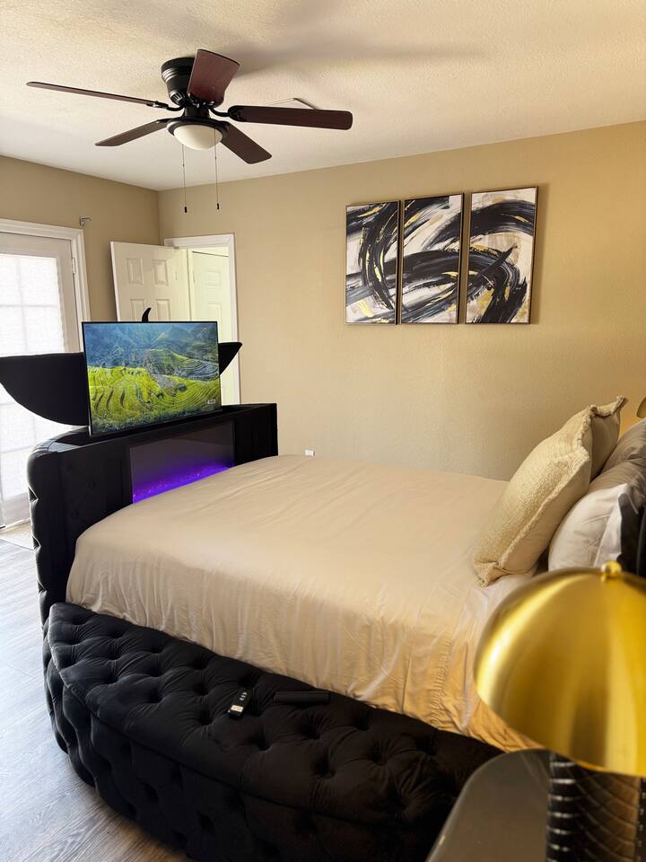 This stylish private suite offers comfort and privacy with a spacious layout, luxe bathroom, and a bed with a built-in pop-up TV. Private entrance and exit. Guests enjoy shared pool access and a separate entrance—perfect for a romantic escape or a solo recharge. Ask about adding the full home, which includes a kitchen, two bedrooms, and a private movie theater for the full experience. 💡 Suite is attached to main home. Main home may be booked separately by other guests.