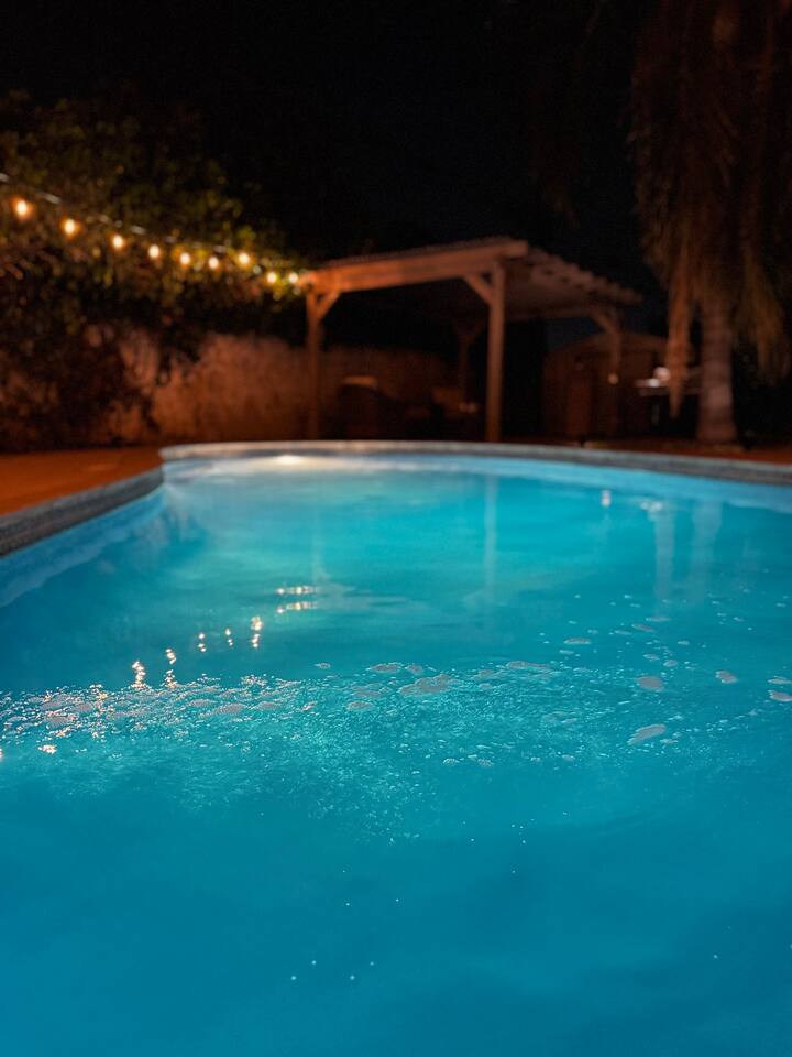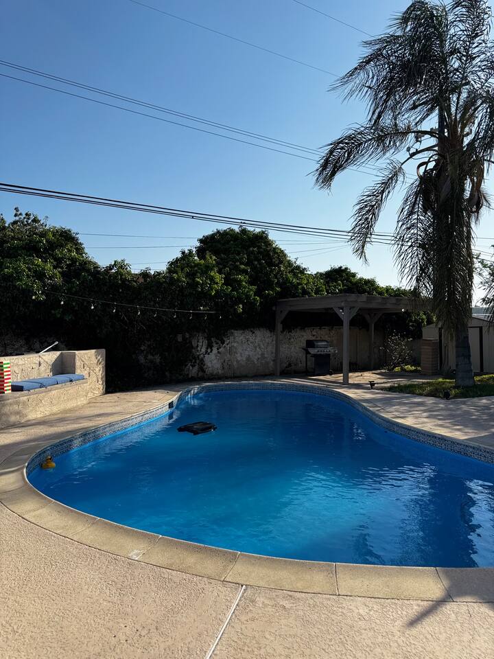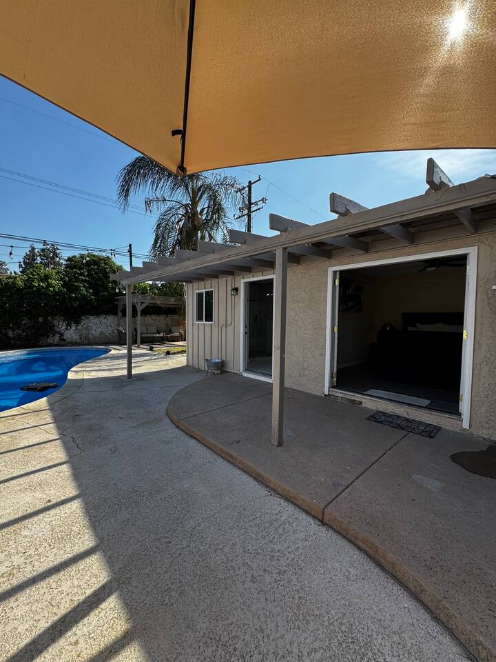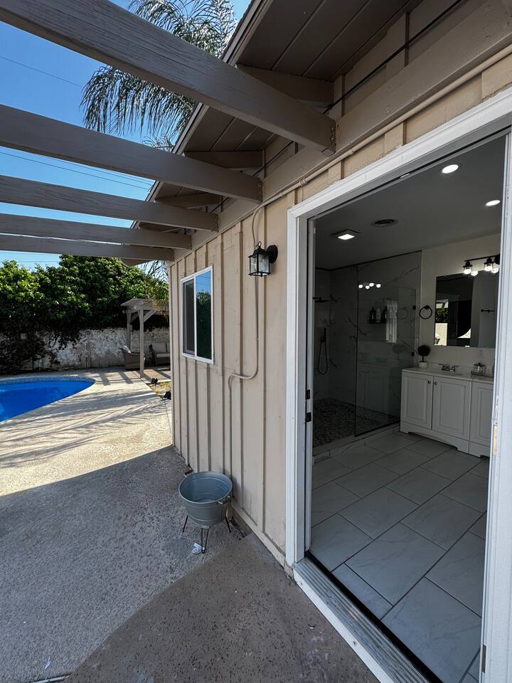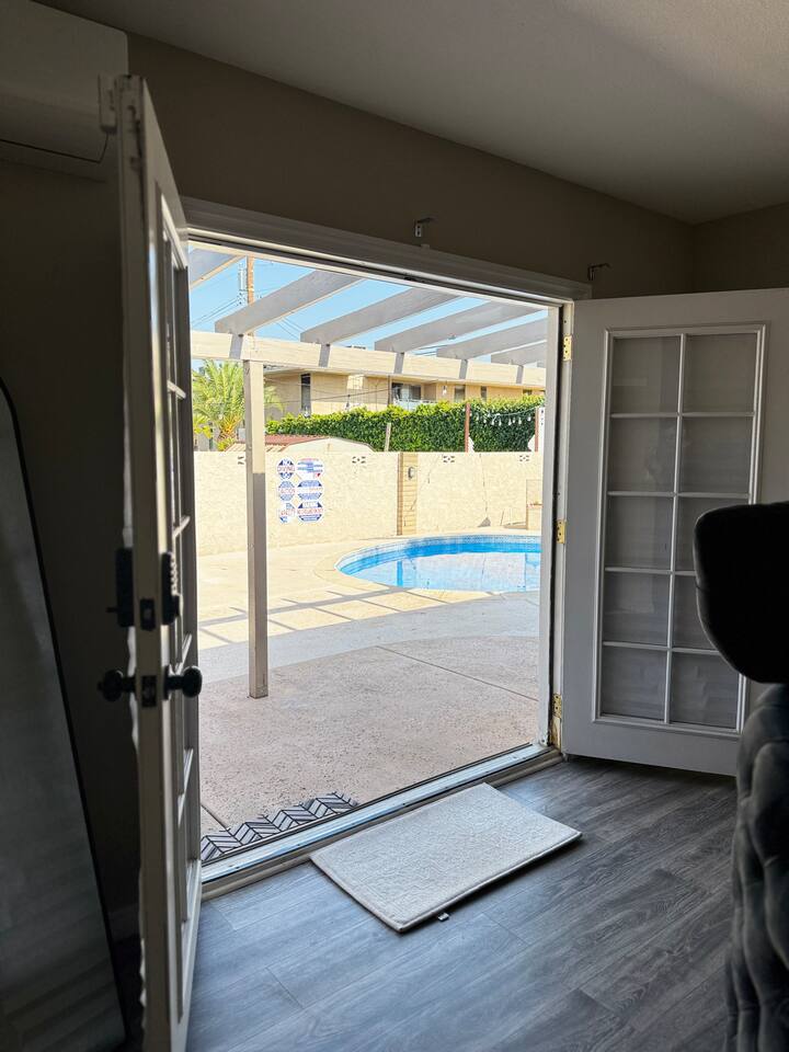 This private suite includes a cozy bedroom with a built-in pop-up TV, a large bathroom, and direct access to a shared pool. The unit has its own entrance and is part of a triplex. Guests can request to add the full home, which includes two extra bedrooms, two baths, a kitchen, and a home theater.