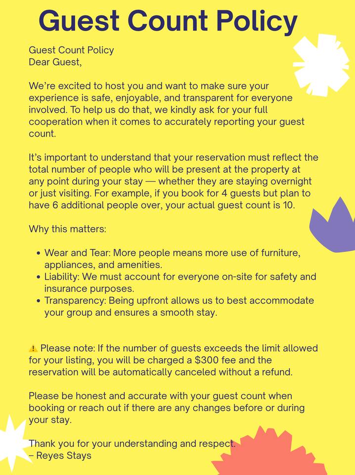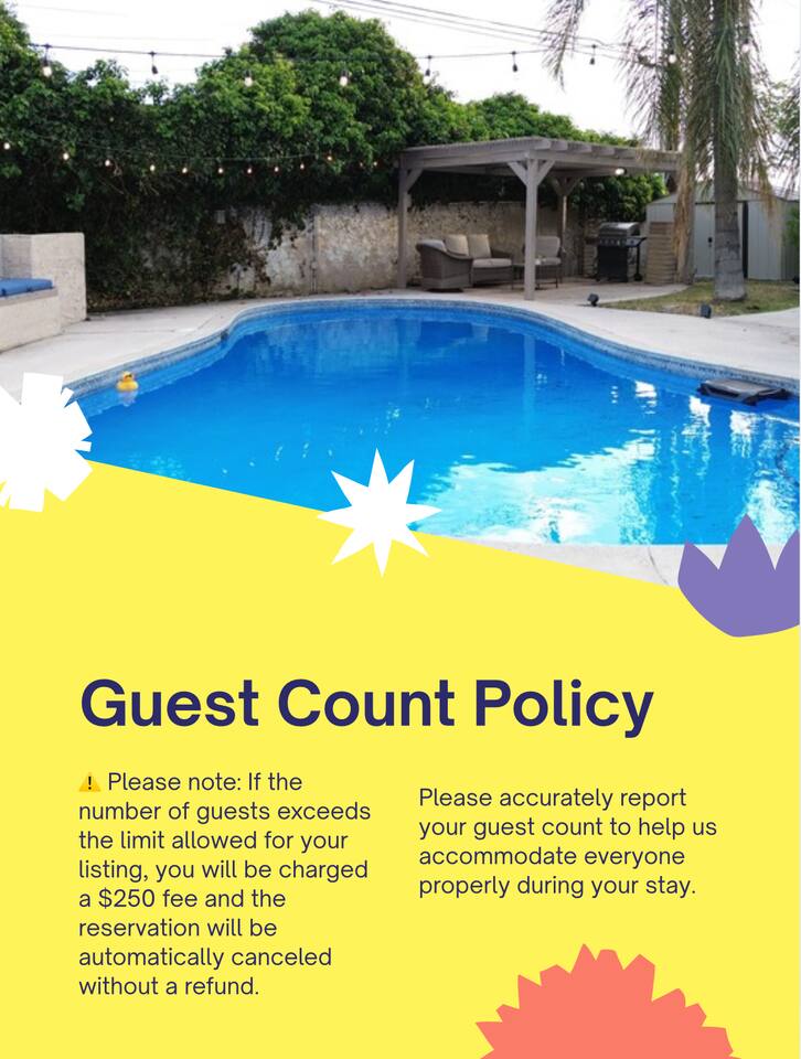We’re happy to offer early check-in and late check-out options at an affordable rate when available. If the option is open, we’ll gladly let you know, or you can always ask us in advance. If extended hours aren’t possible, please plan to check out on time to allow our cleaning team to prepare for the next guests. Please note that late check-out without prior approval may result in an additional charge, up to the equivalent of the nightly rate. This unit is part of a triplex with two other attached units. Pool area is shared, and quiet hours begin at 10pm. No parties or unauthorized guests. Safety Notice: For the safety of all guests, children must be supervised at all times when using the pool or spending time in the outdoor areas. No child should be left unattended outside under any circumstance. We appreciate your cooperation in helping us maintain a secure and enjoyable environment for everyone. Please Note: For the comfort of all guests, no smoking or alcohol is allowed in the backyard or pool area. These are shared spaces, and we prioritize a respectful and family-friendly environment.